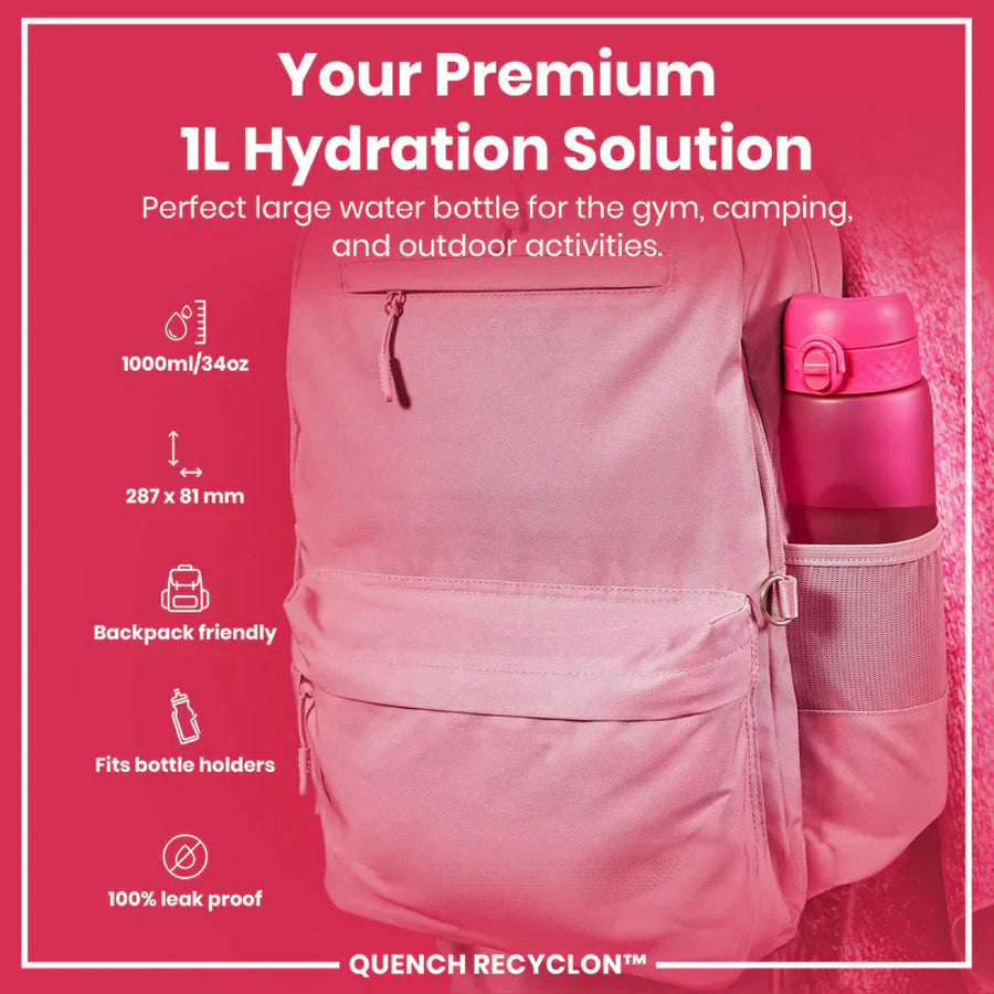 100% leak proof 1000ml / 34oz BPA free sport water bottles with a smooth flow for spill-free hydration and hygienic full-flip top cover for one handed use on-the-go