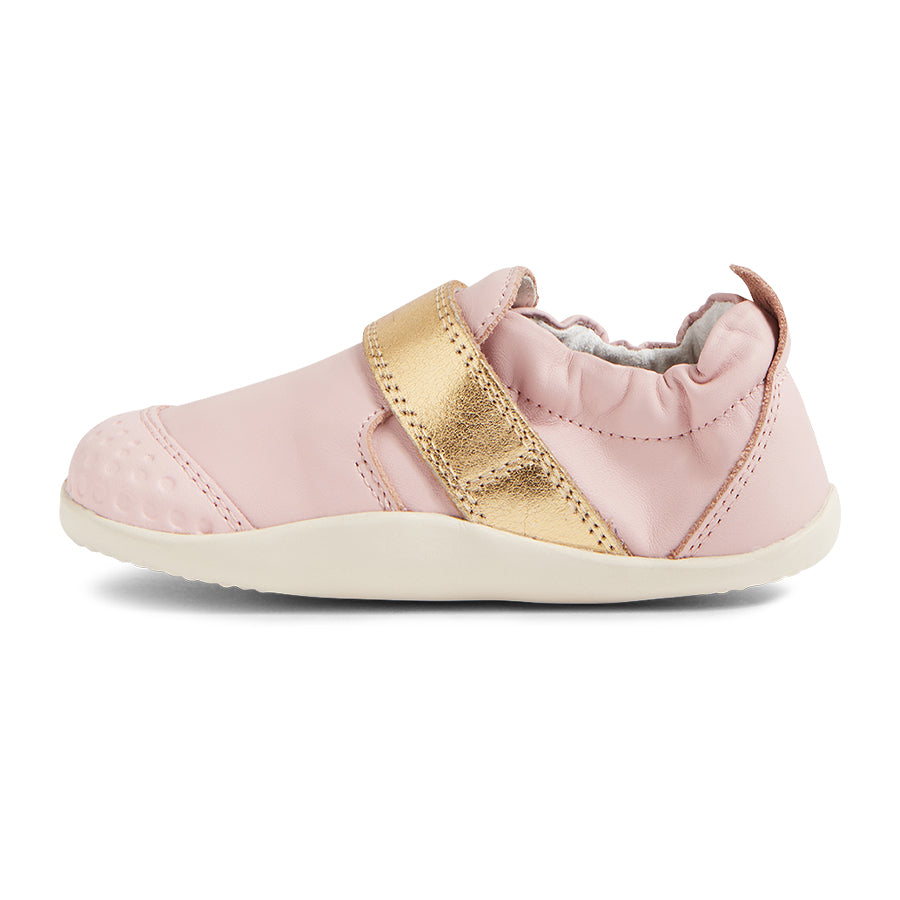 Crafted from premium, soft leather with a single strap fastening, the Go is an easy-on and easy-off shoe designed for little cruisers. With an embossed leather toe cap to prevent scuffing when upside down and a super lightweight, flexible sole, there is no better option for crawlers and pulling-themselves-up kids than the iconic Bobux Xplorer Go. Pretty and pleasing, this shoe is suitable for crawlers and fits true to size.